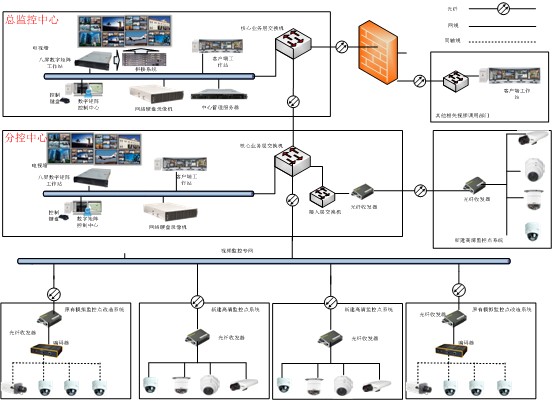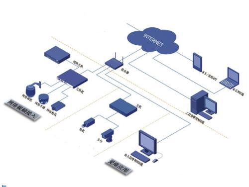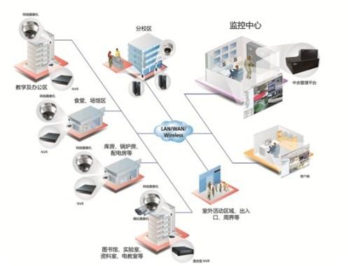 校园安防系统,以校园网为核心,可充分利用已有线路,或根据布线的难易,在学校内同时采用不同的设备,设立多个子系统。如某栋楼内建设矩阵或DVR子系统,将楼内各监控点的音视频及控制线集中到分控中心,在分控中心将各种信号统一接入校园网。在具有信息点的监控位置,直接采用网络一体球将音频和视频图像经
